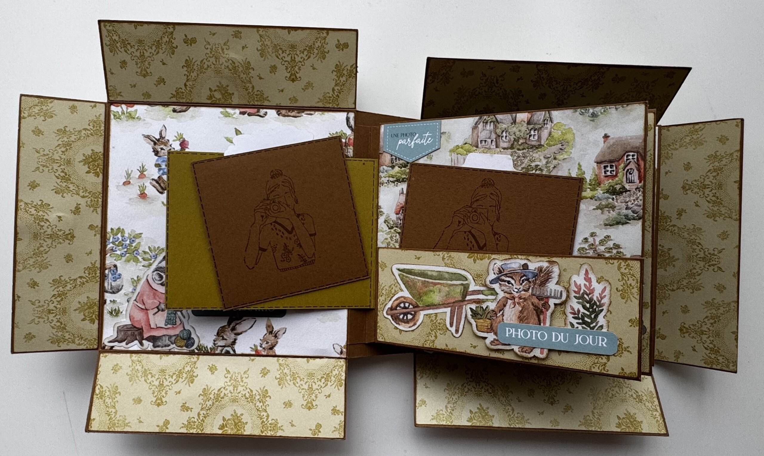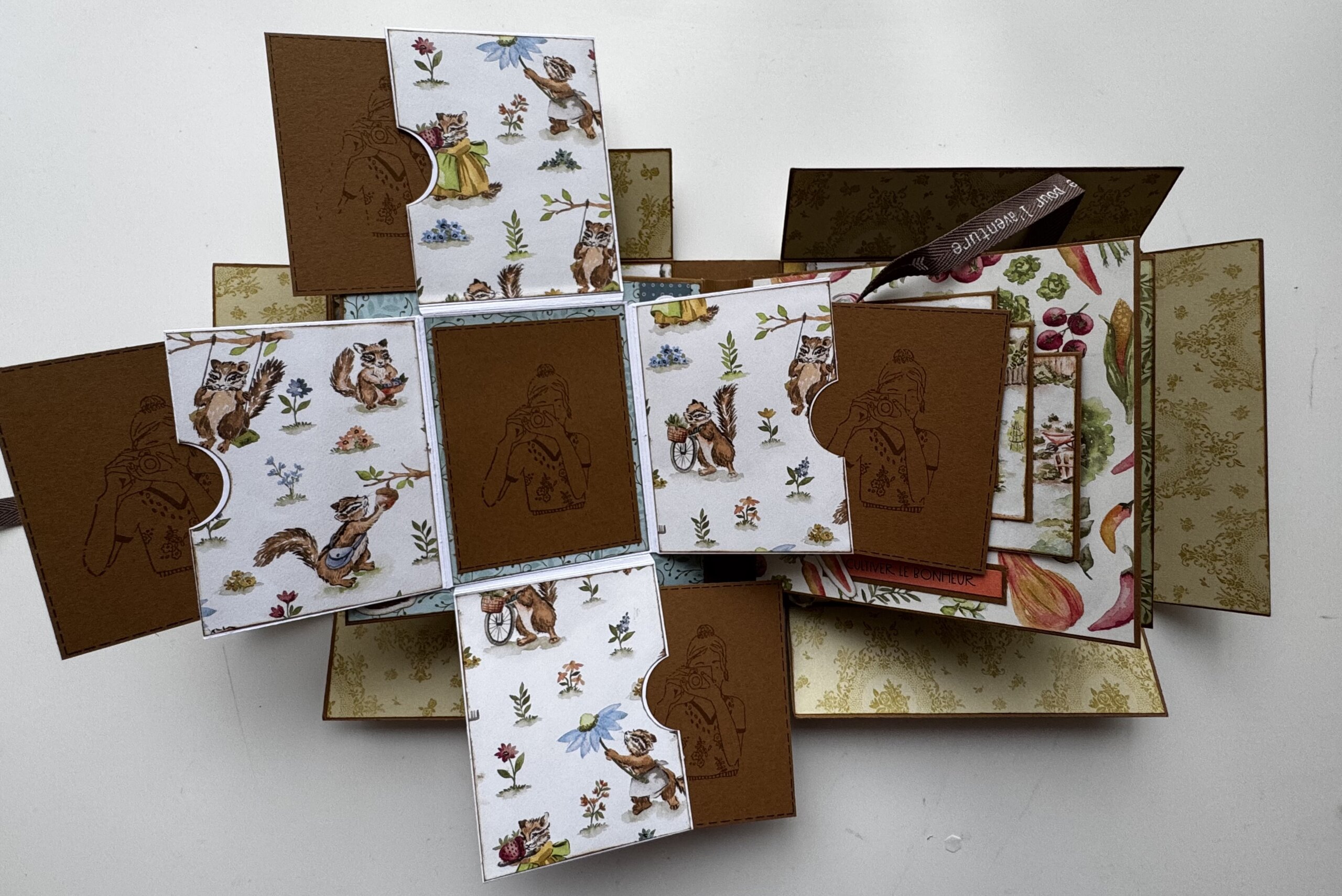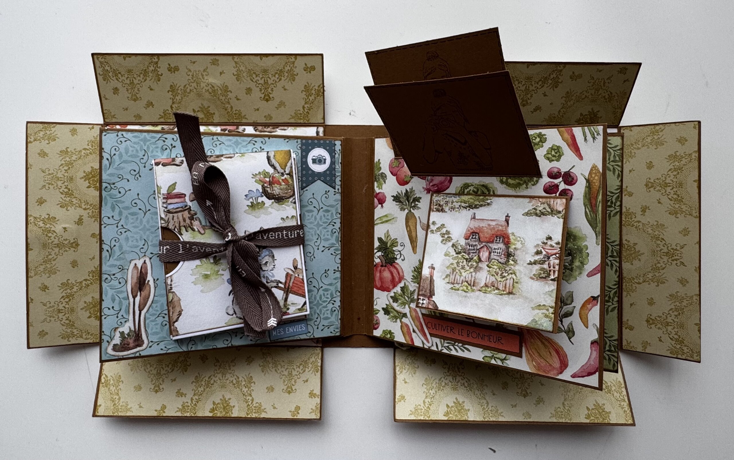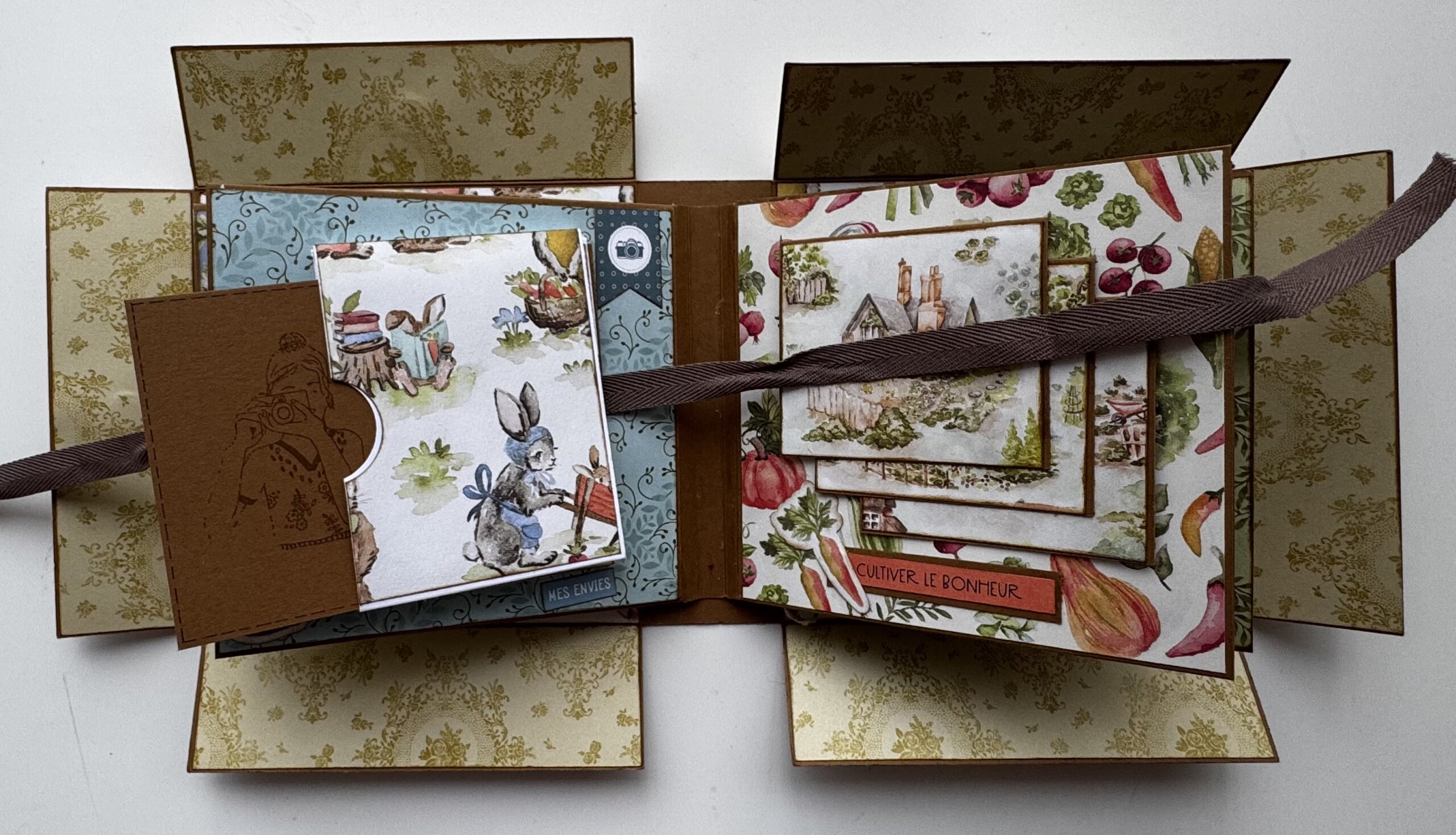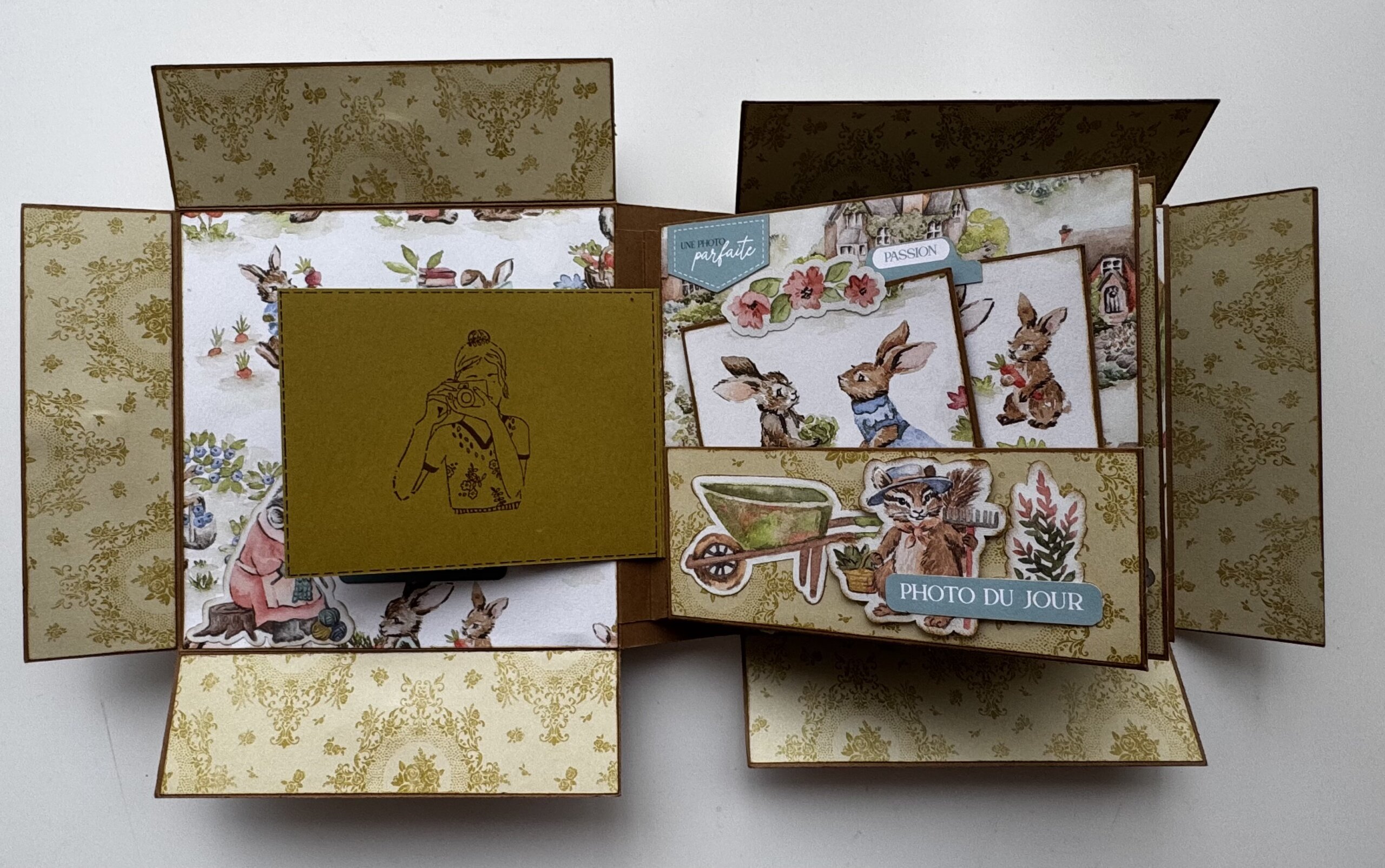 Je l’ai réalisé avec la collection de papier « Livre de contes » de chez Stampin’up. L’album de l’atelier reste bien sur la surprise, mais nous, nous approchons du printemps.
