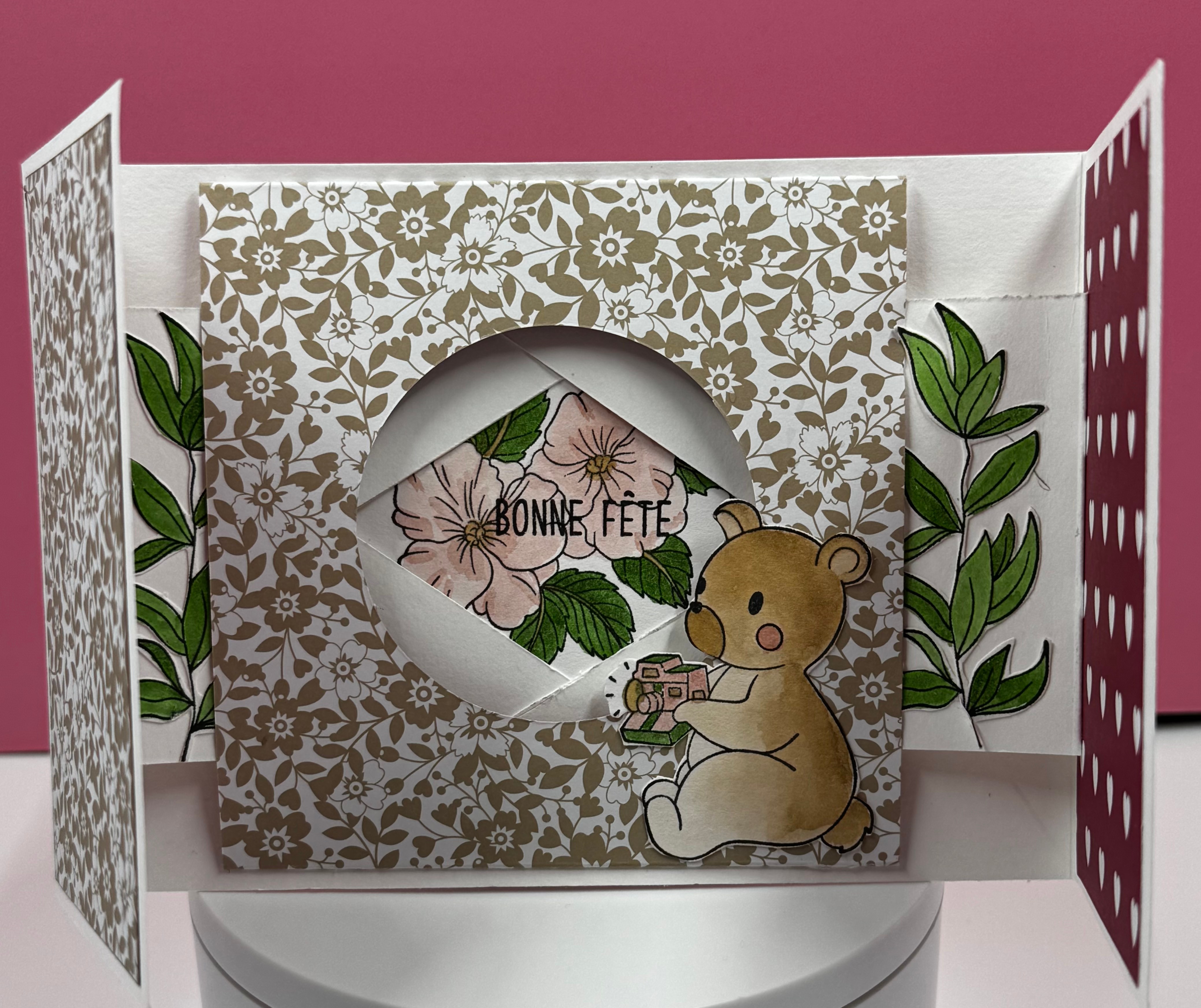 Lorsque que l’on ouvre cette carte, l’intérieur s’ouvre comme un appareil photo, et nous fait découvrir une belle image, une photo, un tampon ou un sentiment.