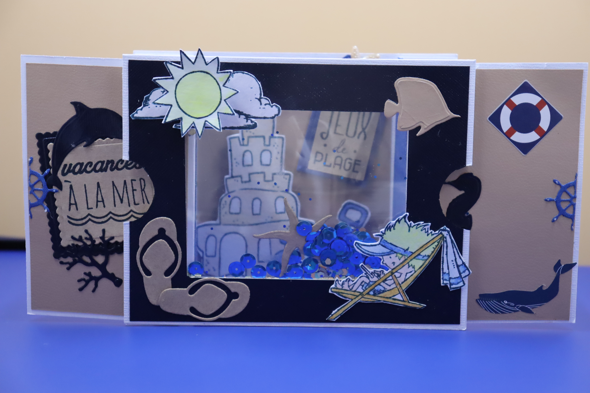J’ai réalisé cette carte avec les matières de Lilly pot de colle comme le skivertex et le tissu intissé brun et marine.Une carte théâtre qui s’ouvre pour nous faire découvrir un monde marin.