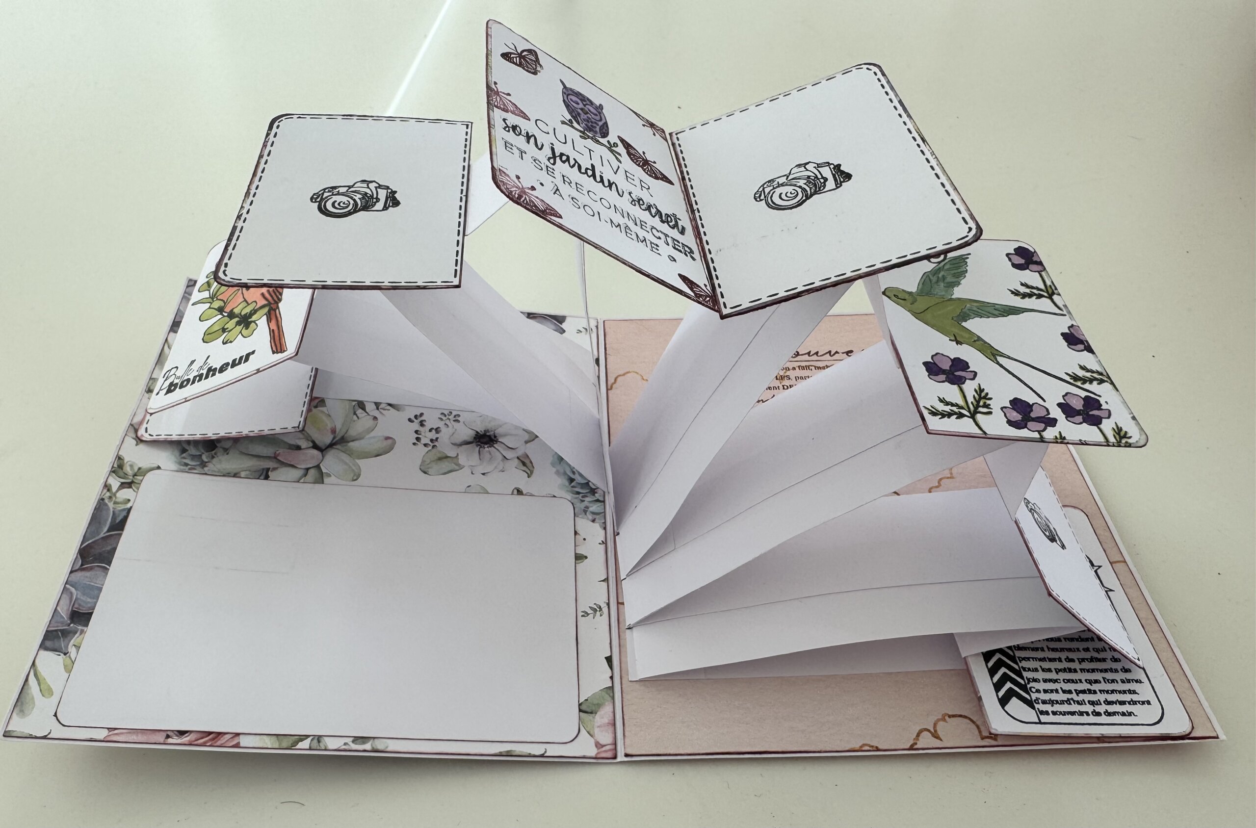 Avec ce jeu de pliages et de volumes, la carte ne se contente pas de transmettre un mot d’anniversaire : elle devient un objet ludique et surprenant, qui se transforme en petite scène à chaque ouverture.