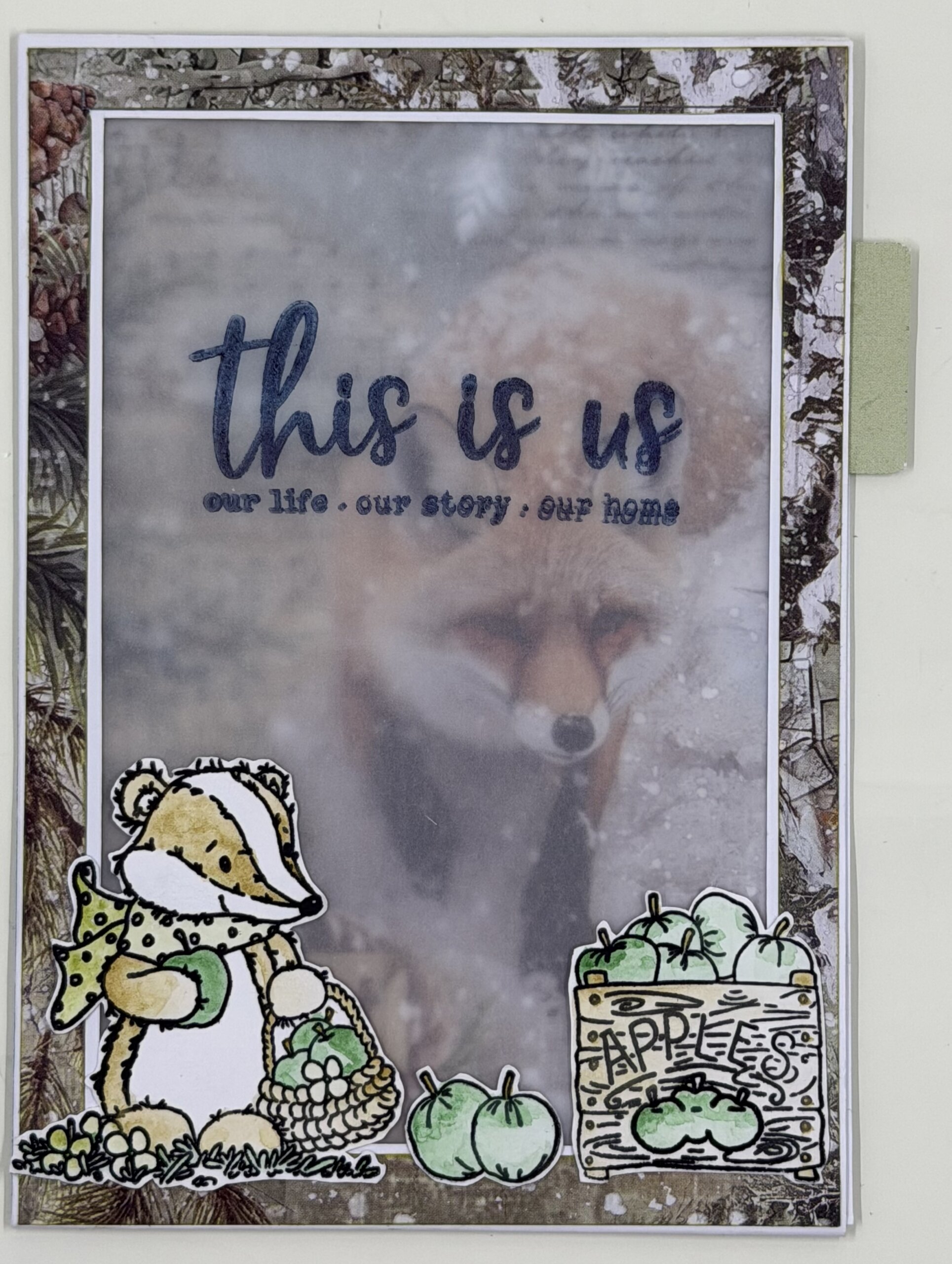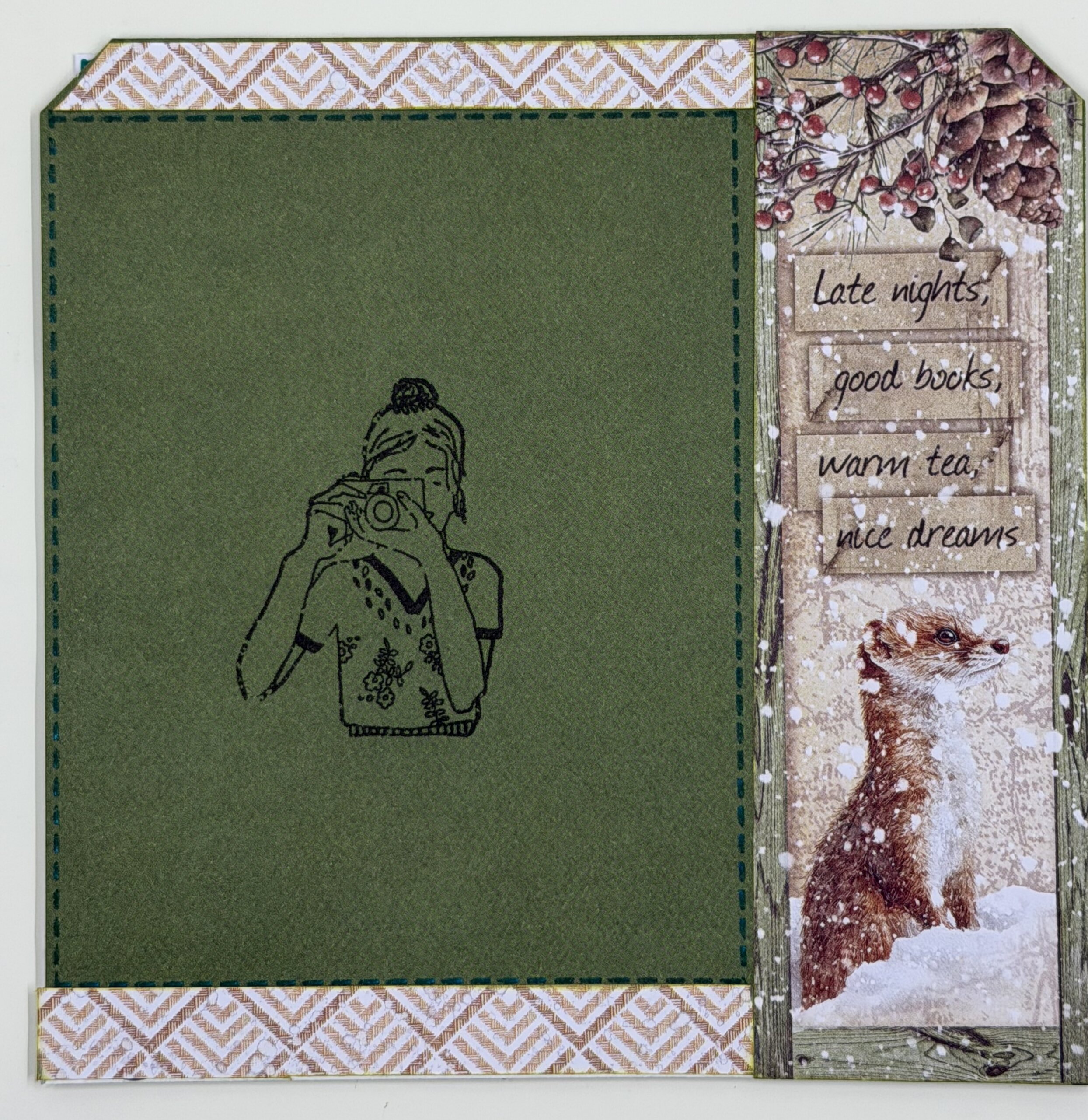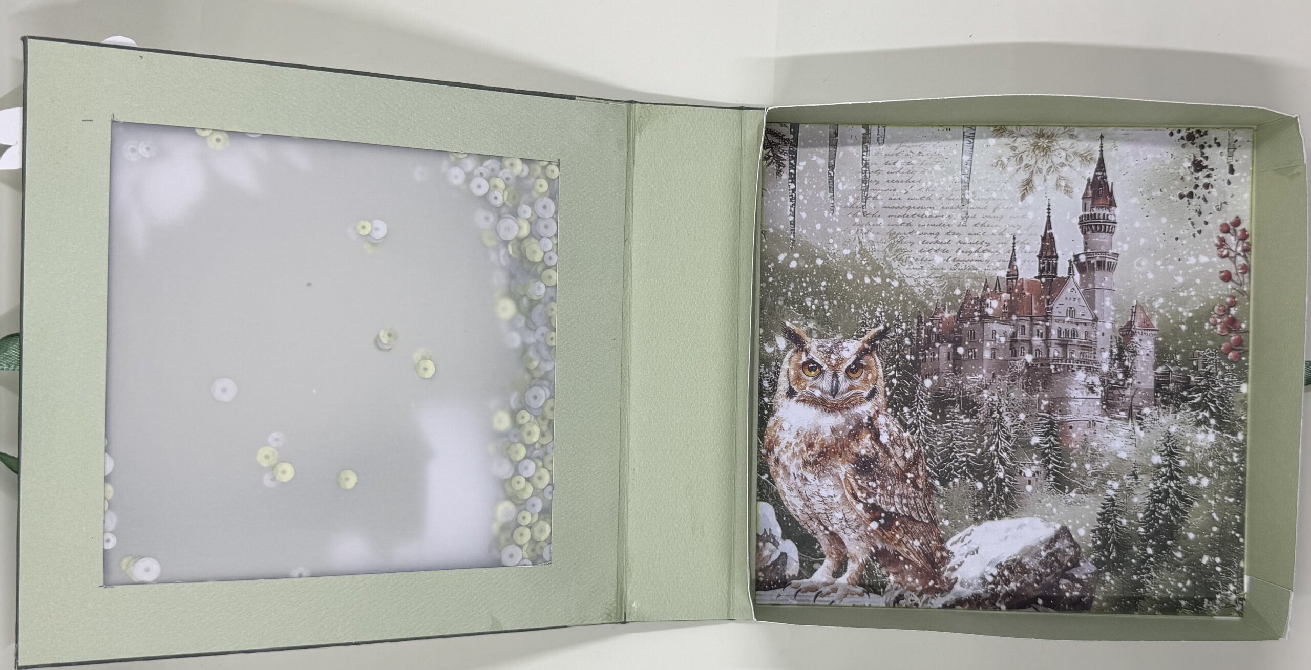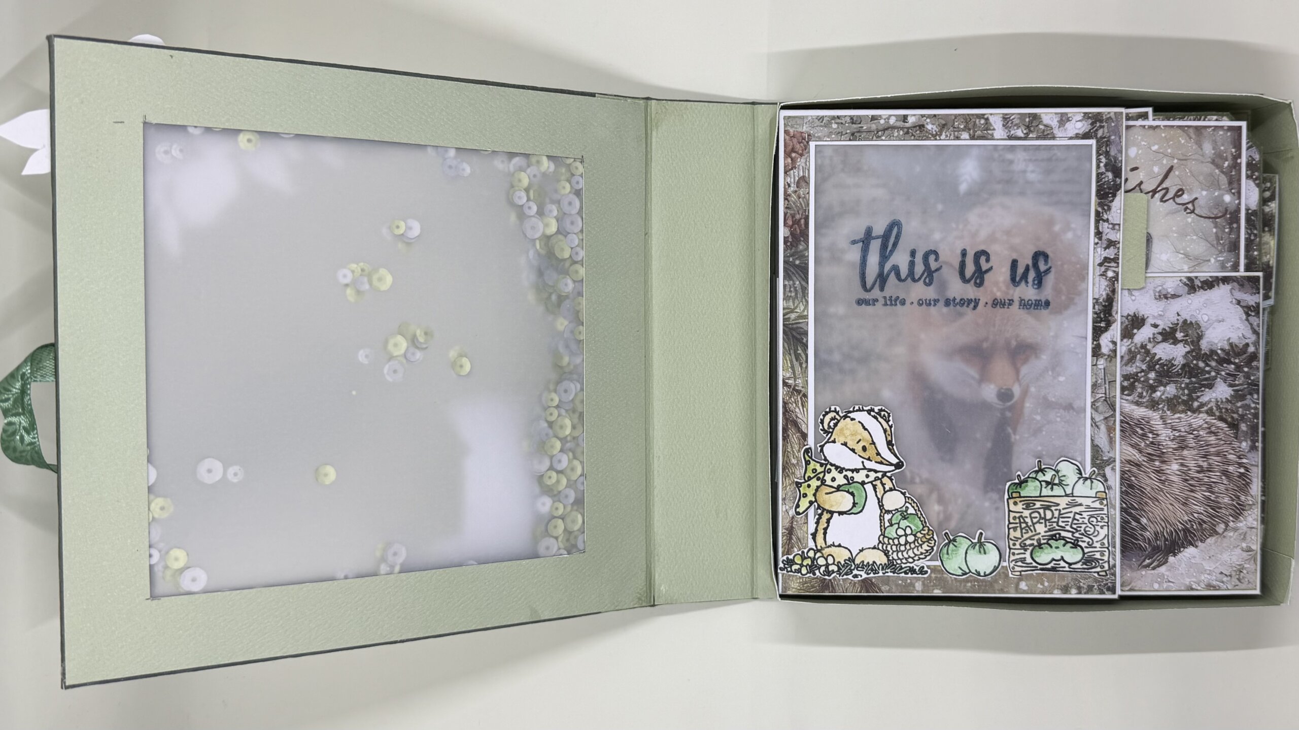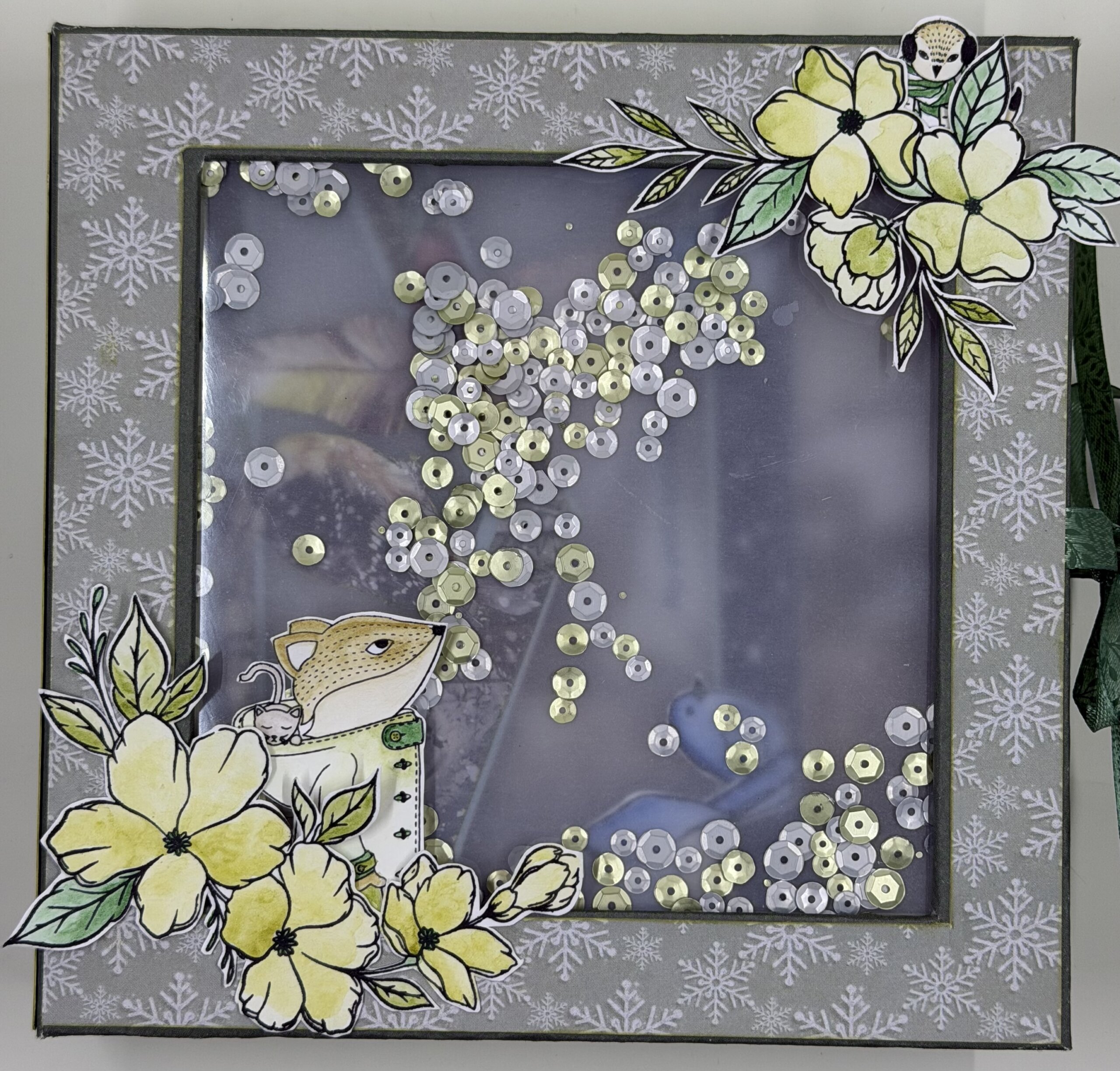 La couverture est sublimée par une fenêtre shaker remplie de sequins soigneusement assortis aux papiers, apportant mouvement et éclat à l’ensemble. Les embellissements colorisés à la main viennent donner relief et douceur au projet.