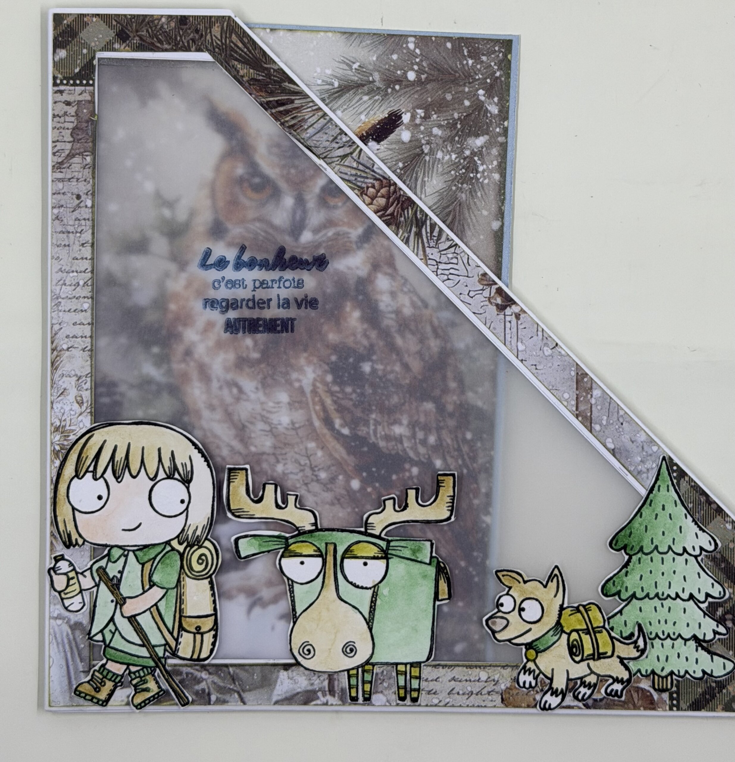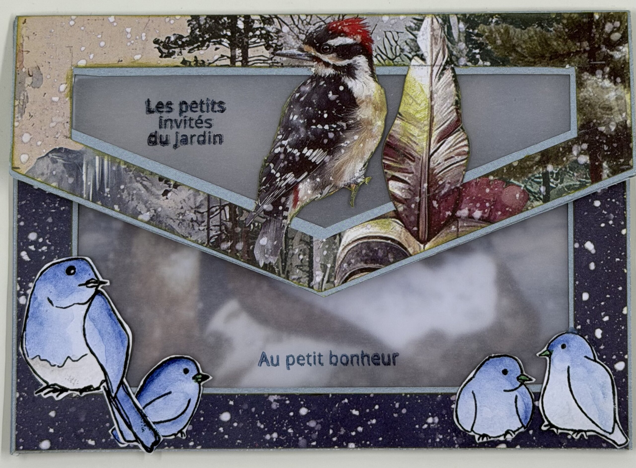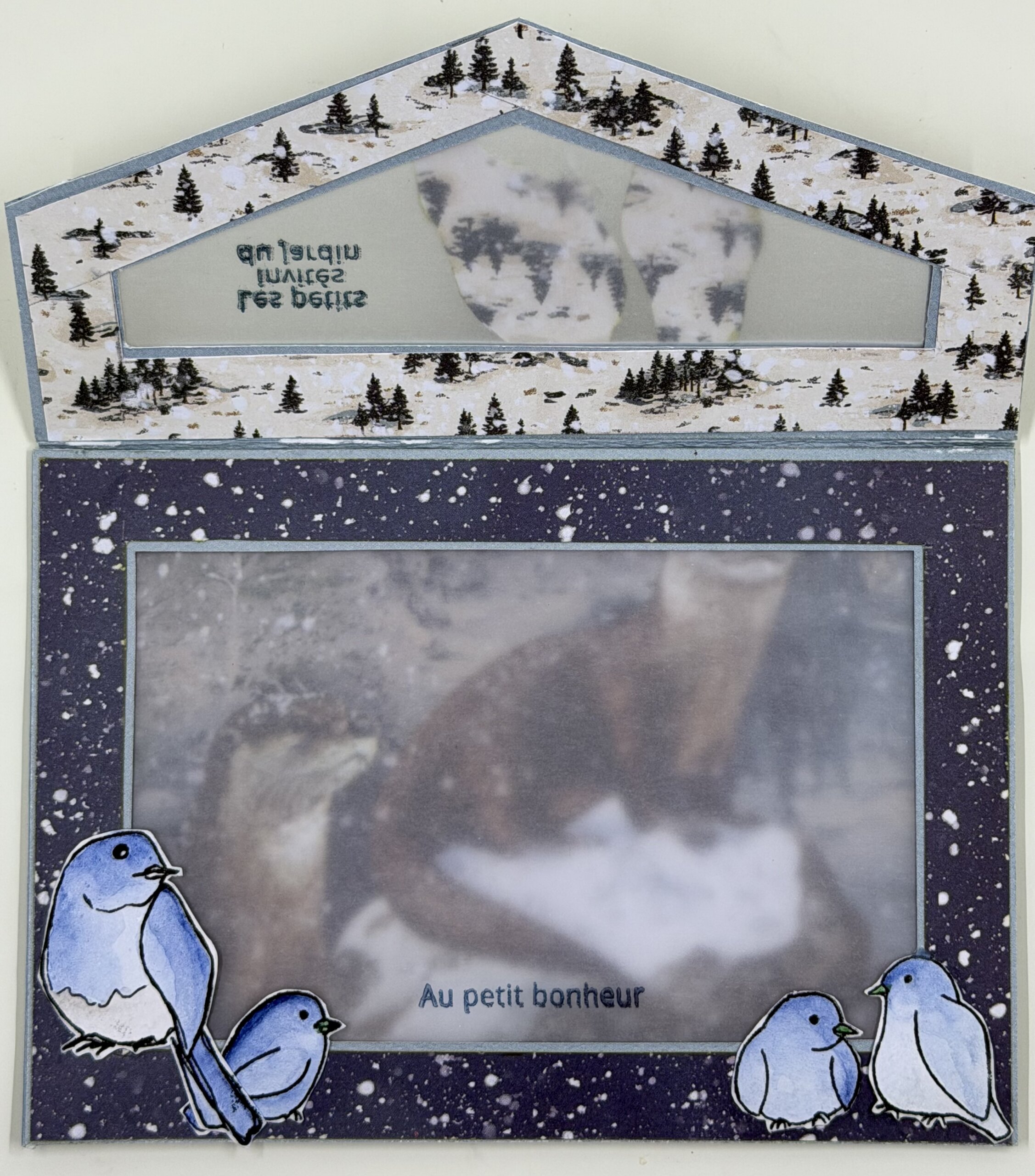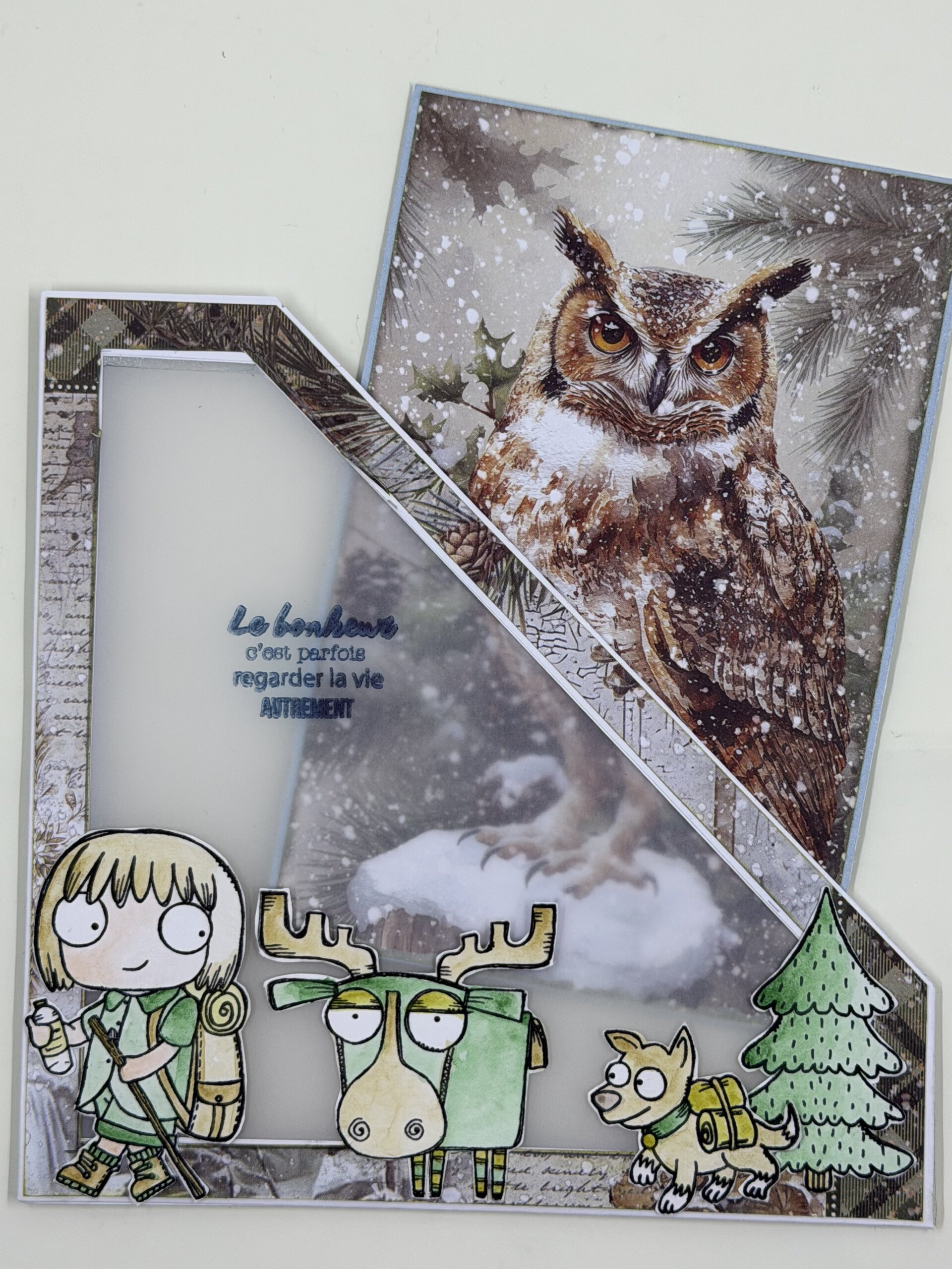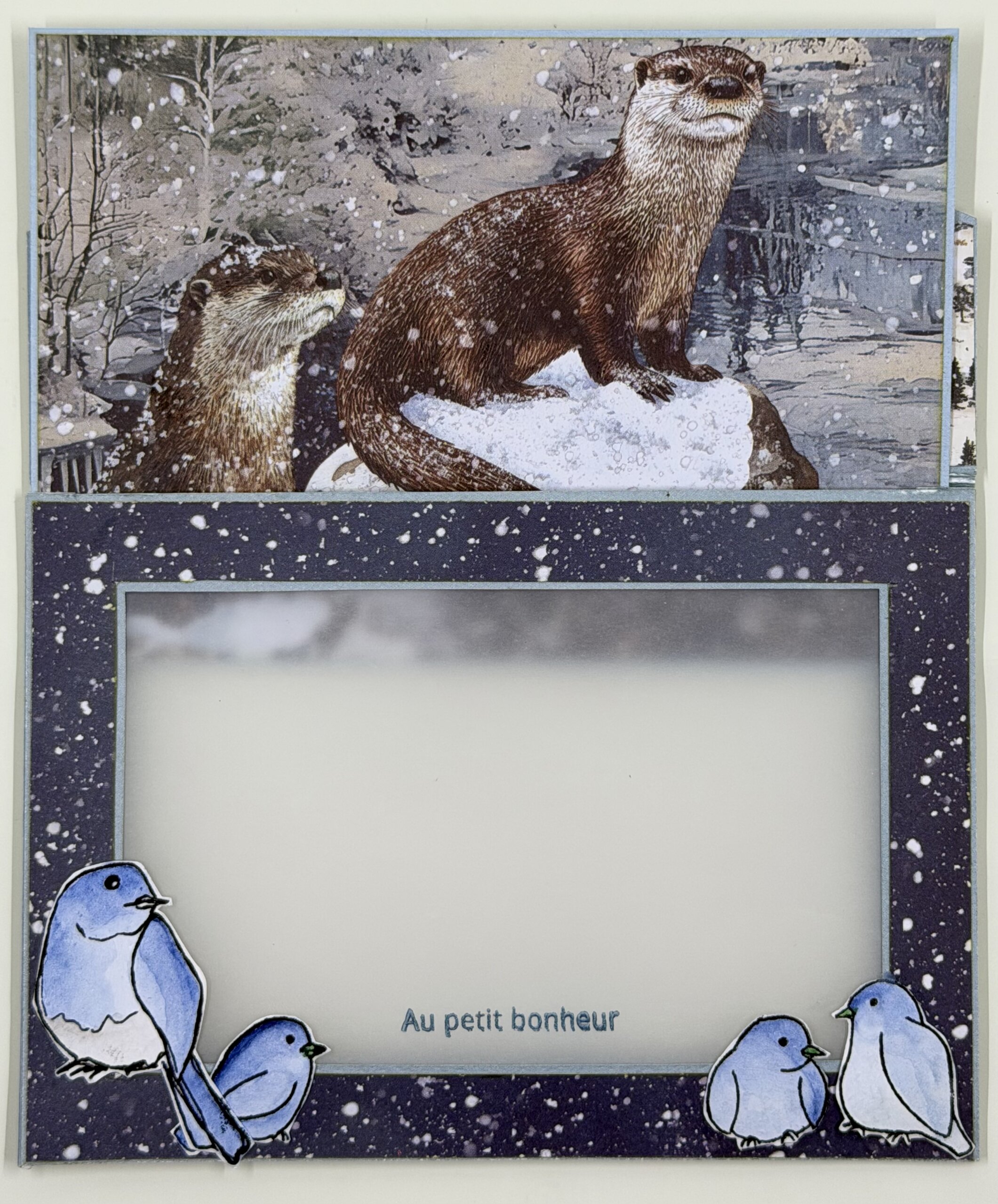 La couverture est sublimée par une fenêtre shaker remplie de sequins soigneusement assortis aux papiers, apportant mouvement et éclat à l’ensemble. Les embellissements colorisés à la main viennent donner relief et douceur au projet.