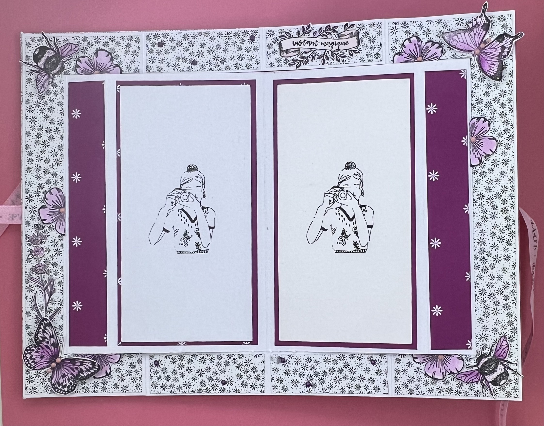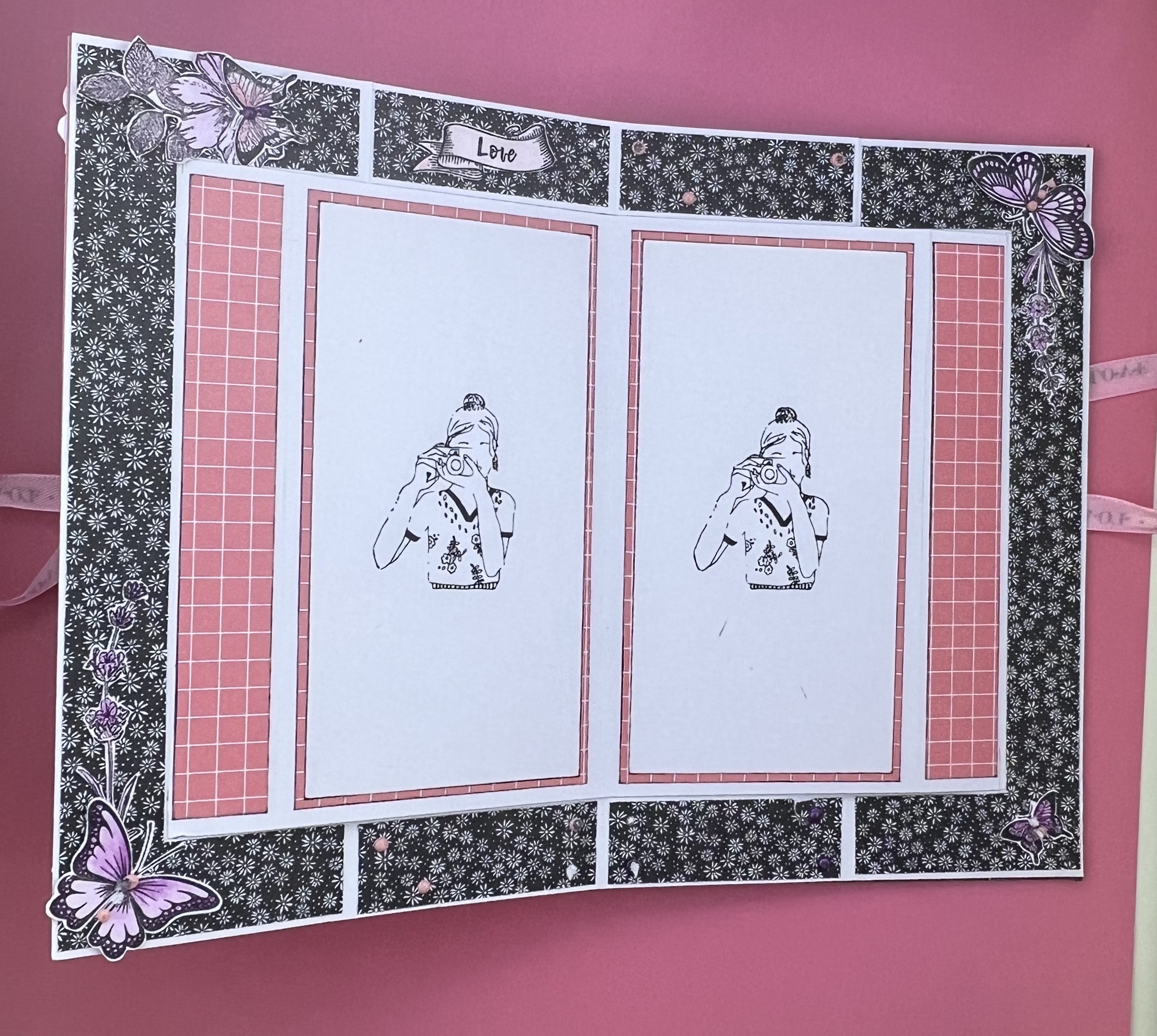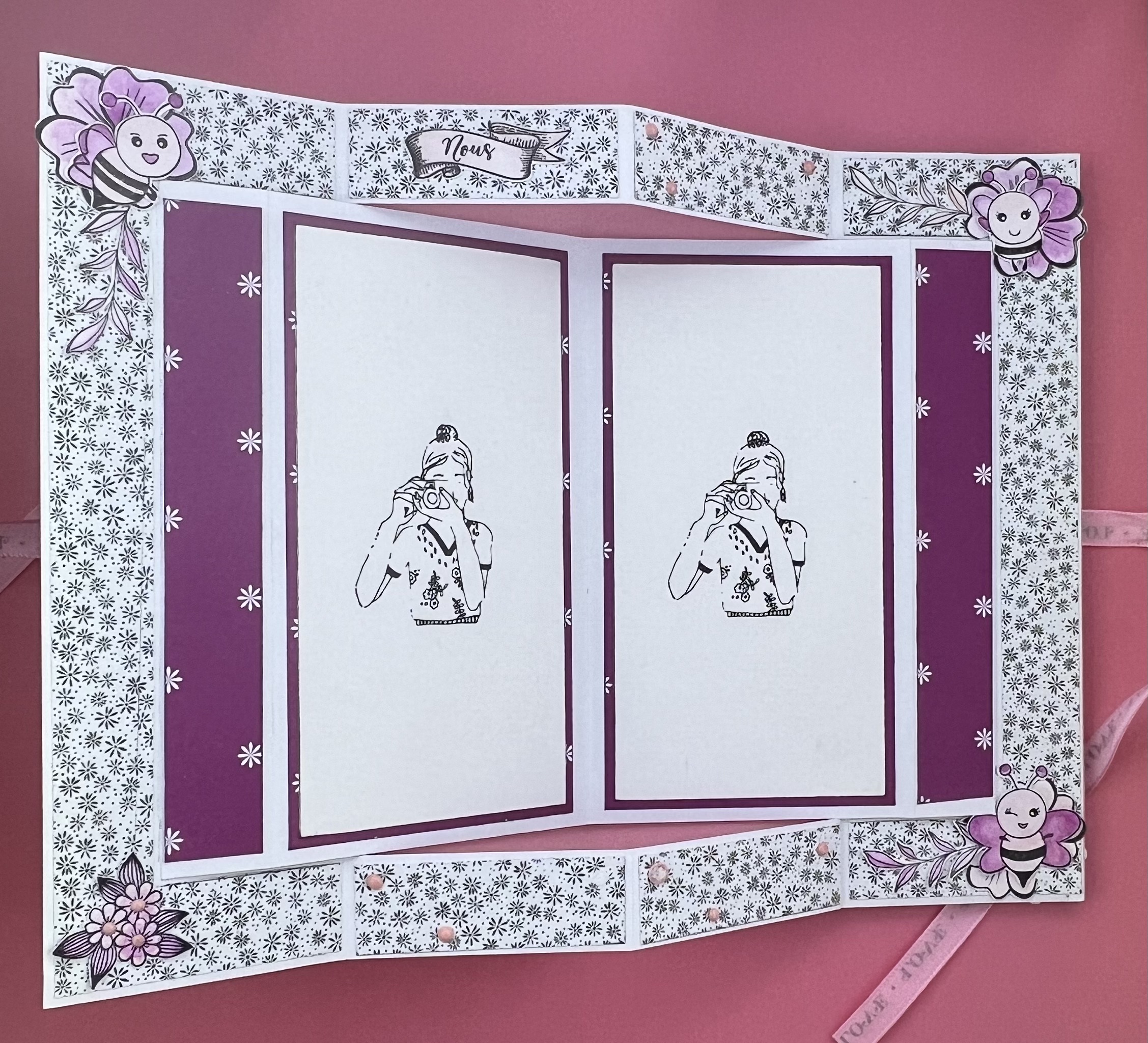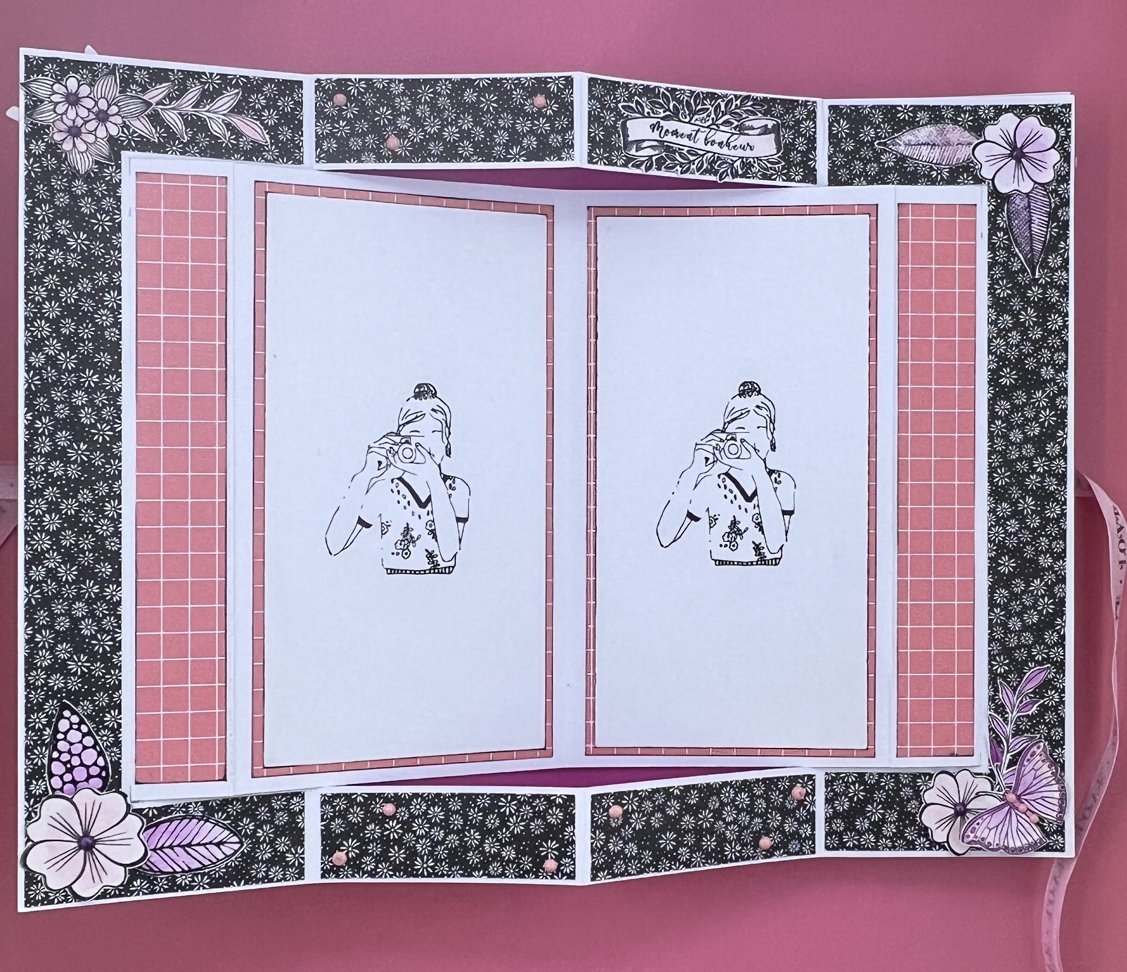 J’ai utilisé du noir et blanc avec une touche de rose, avec quelques tampons colorisés.