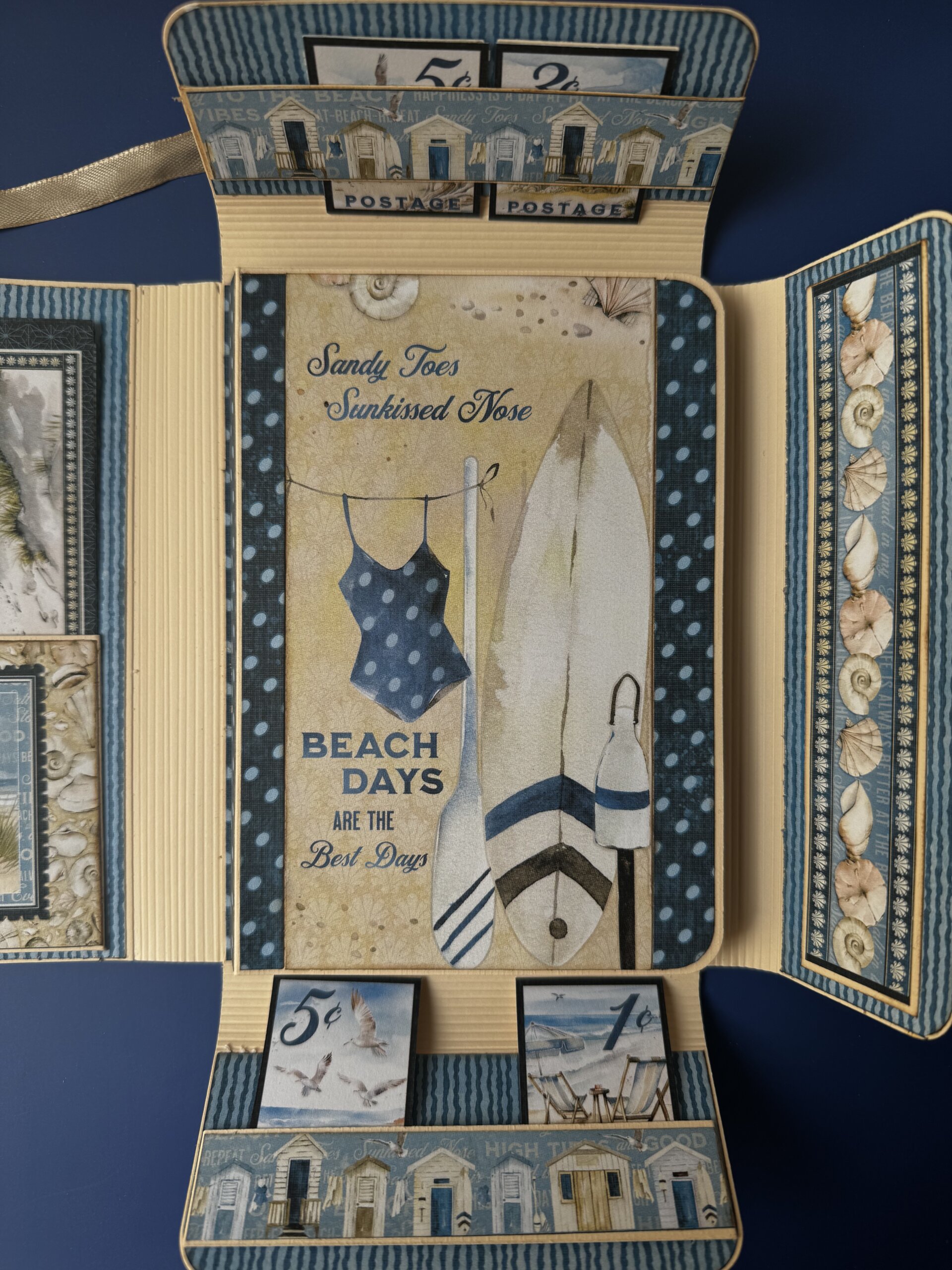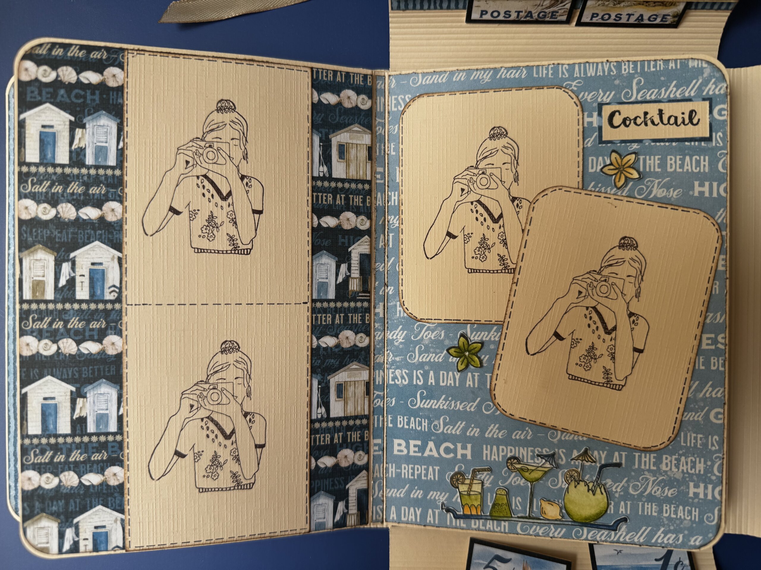 Pour ce projet, j’ai utilisé la collection de papier de chez Graphic 45 , The Beach is calling, accompagné d’un cardstock couleur sable. Il peut contenir une vingtaine de photos.