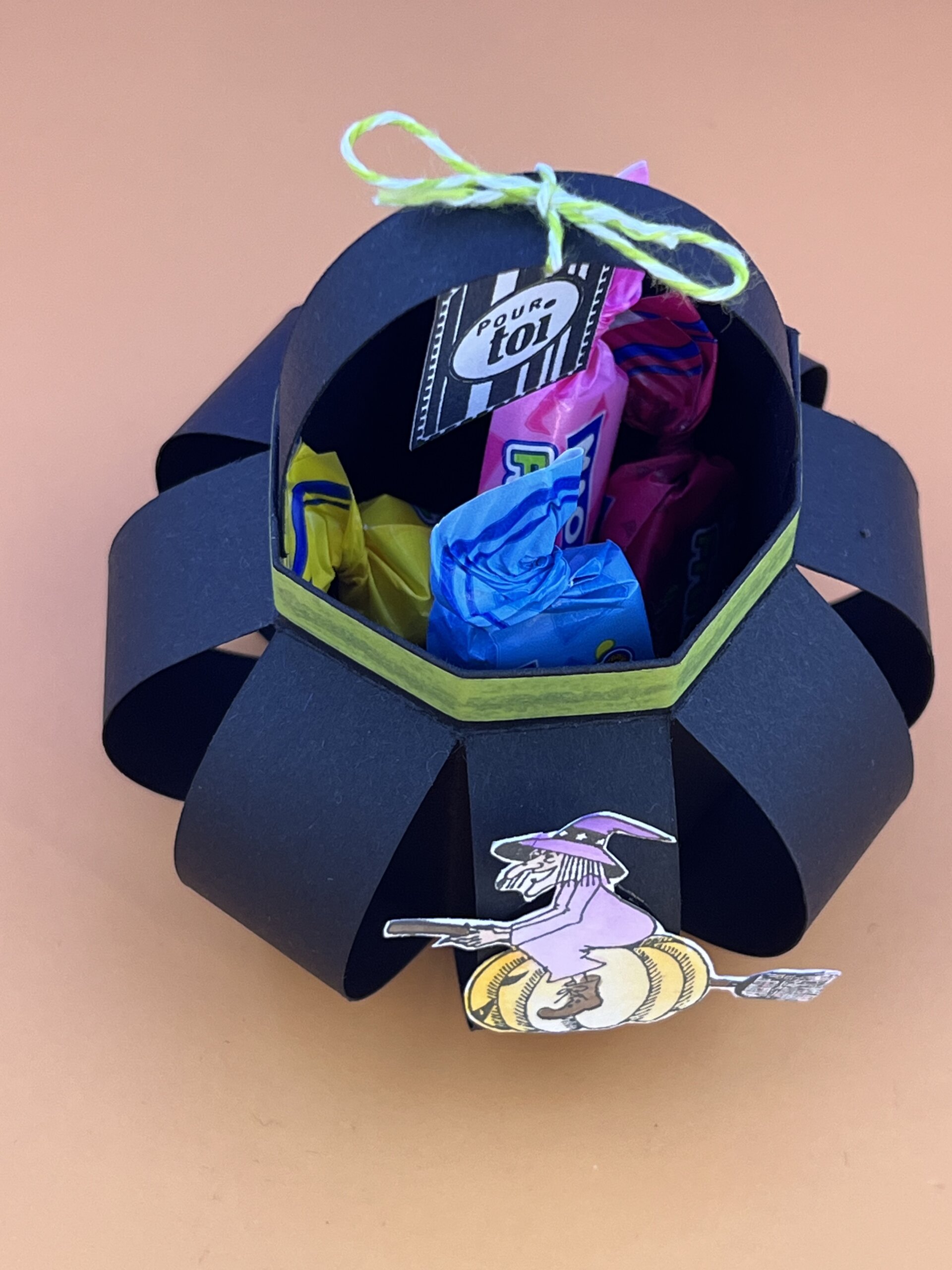 Pour le plaisir de nos adhérentes, j’ai réalisé de petits chaudrons contenant des bonbons. Un peu d’avance sur Halloween, mais pas pour les idées.