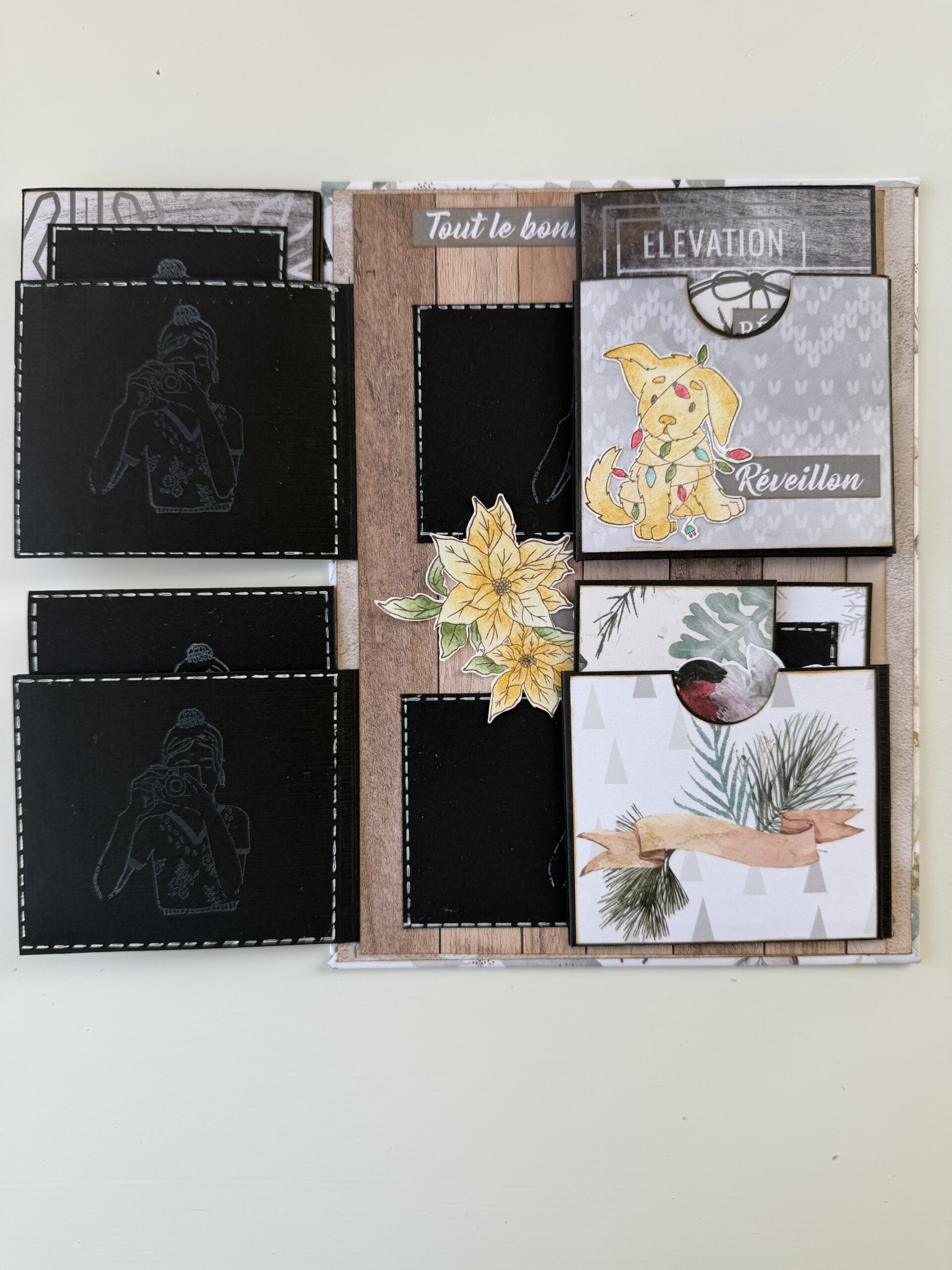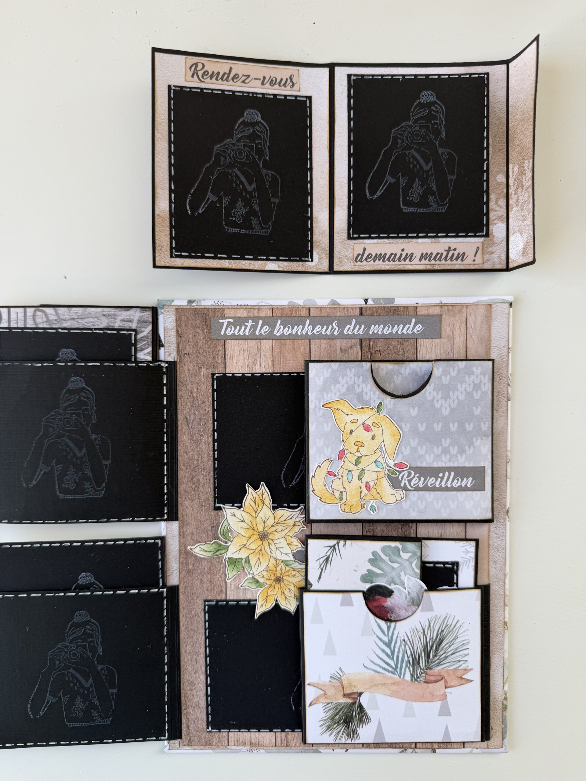 Conçu sur une base solide en cartonnette, il se compose de quatre volets qui s’ouvrent et dévoilent, pas à pas, une série de dépliants intérieurs pensés pour accueillir vos plus beaux souvenirs.